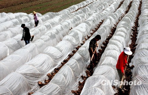 2010年3月20日,四川广安市武胜县飞龙镇农民在田间给刚覆盖在苗床上的薄膜压边土。广安市自去冬以来雨量偏少,加上连日气温持续偏高,旱情加重。为不误农时,广安市启动抗旱应急预案,积极组织人力、财力、物力,千方百计保证农业用水,抢时春播春种,保证农民增收。 中新社发 邱海鹰 摄