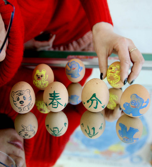 安徽省淮北市市民正在把鸡蛋立起来。王文 摄