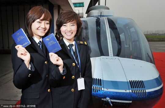 3月22日,谢曦垚和马洋经过一年的培训、飞满105个小时,经过考核顺利取得了驾驶执照,她们成为国内民航首批直升机女飞行员。