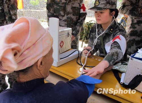 连日来,解放军三0三医院组织的博士医疗队在广西百色、河池等地为旱区群众查体看病,讲解相关预防保健知识,并出资运送灾民急需的“生命水”和药物。图为女军医在广西河池市巴马瑶族自治县东山乡为旱灾群众巡诊。中新社发 夏志勇 钟岚 摄