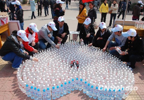 3月29日,山东潍坊学院的大学生志愿者们垫付现金购买了近2000瓶矿泉水进行义卖。义卖结束后,他们会将善款悉数邮寄给缺水的西部同胞。中新社发 孙树宝 摄