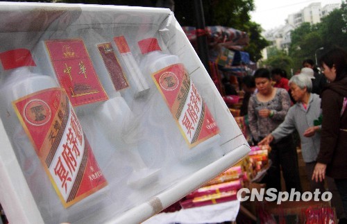 南宁市上海路清明祭品市场上摆放的一个祭祖“名烟名酒”“礼盒”。 中新社发 陆波岸 摄