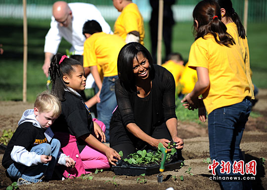 3月31日,美国第一夫人米歇尔奥巴马在华盛顿白宫和一群小学生一起参加年度春季花园种菜活动。