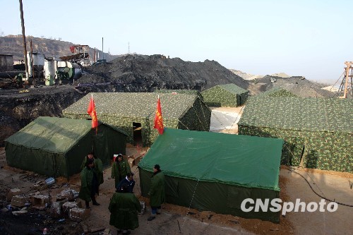 4月2日上午,记者在华晋焦煤有限公司王家岭矿透水事故抢险现场看到抢险帐篷已在离井口50米处搭起,届时抢险工人将在这里休整,为搜救井下矿工提供便利。中新社发 张云 摄