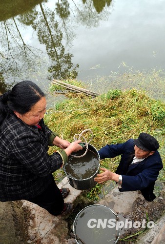 2010年4月1日,四川广安市岳池县酉溪镇太平寨村73岁的彭昌祥老人,在给乡亲们免费发放自己投资修建的山平塘里的水。太平寨村是旱山村,多年来饱经干旱之扰。退休后在家务农的彭昌祥老人于2004年起,用自己多年积蓄和退休工资围沟建塘。由于经验不足,修建的山平塘年年塌陷,老人年年补修。今年初,老人借款5万余元,请来水利技术人员指导,对山平塘进行大修,终于建成一座坝长40米、高15米、可蓄水4万余方的山平塘。老人花费资金15万元,终于了却心愿。