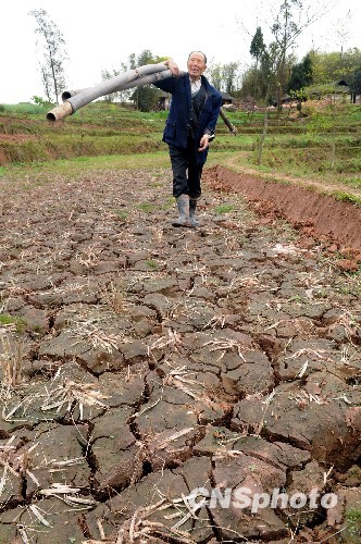 由于去冬今春持续少雨,村内今年再次面临干旱,老人自建的山平塘为乡亲们解了忧愁。为了帮助村民抗旱,彭昌祥主动搬来抽水机,将山平塘里的水免费抽给村民。中新社发 邱海鹰 摄