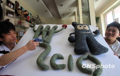 4月2日,美发师对用头发丝制成的上海世博会会标作最后的修整。随着上海世博会的临近,北京五道口附近的一家理发店的美发师黄鑫,为表达对上海世博会的热切期盼,把为顾客剪下的头发丝积攒起来,制作完成了世博会吉祥物“海宝”、“中国馆”等模型。据介绍,制做这些模型一共用了5.1公斤的头发,经过清洗、褪色、上色等六道工序,耗时4个月才完成的。美发师黄鑫现在最大的心愿,就是把这些作品拿到上海世博会上向中外来宾展示。