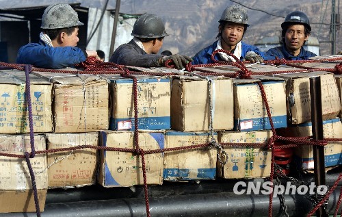 4月5日下午,山西王家岭煤矿透水事故抢险救援指挥部召开第十次新闻发布会。新闻发言人刘德政通报称,目前,此次事故井下153名被困人员中已有115人获救,救援工作取得重大进展。对剩下的被困人员救助工作正在进行中,现场抢险救援仍在紧张继续,人们仍在企盼奇迹发生。图为救援人员准备往井下输送救援物资。 中新社发 高增平 摄