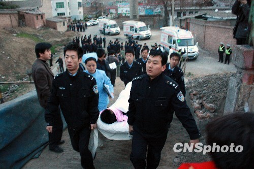 6日6时16分,“3•28”透水事故获救重症工人被公安民警抬上去太原诊治的专列。中新社发 王卫平 摄