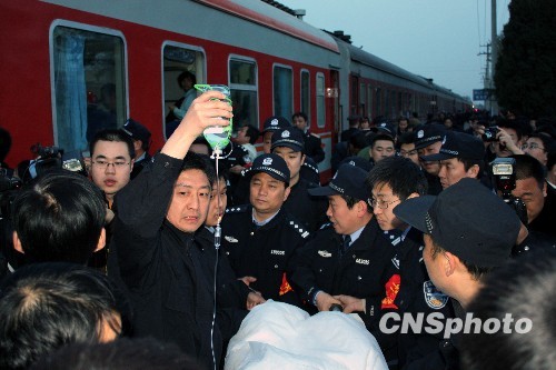 6日6时18分,“3•28”透水事故获救重症工人被公安民警抬上去太原诊治的专列。中新社发 王卫平 摄