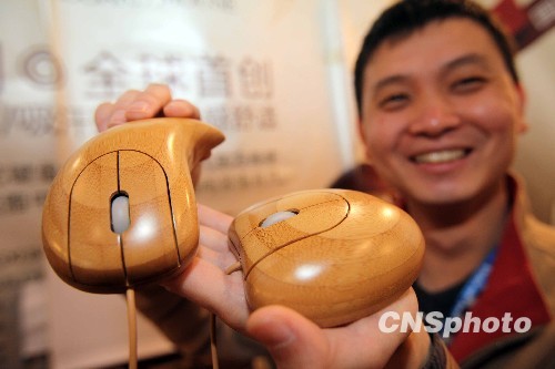 一家参展企业展出了用竹制材料制成的电脑、键盘、鼠标等产品,这些电脑配件不仅具有抗静电、防辐射、吸汗等功能,即使产品将来淘汰不用了,竹材料还能降解,对环境不会造成危害,吸引了许多观众驻足观看并洽淡合作事宜。中新社发 陈晓根 摄