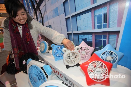 一家参展企业展出了节能环保迷你电扇。这种电扇可使用交、直流电也可充电,还能直接插在电脑USB接口使用。由于该电扇采用无碳直流电机,比普通电扇节能40%左右,寿命是普通电扇的3倍。中新社发 陈晓根 摄