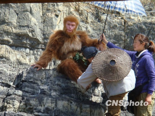 张纪中版《西游记》剧组部分演职人员从浙江宁波象山转场到舟山桃花岛拍摄。图为,在4月10日的开机仪式后,剧组拍摄悟空初到桃花岛“全裸”吓坏正要出海打渔的渔民,并“害羞”抢走渔民衣服的剧情。中新社发 柴燕菲 摄