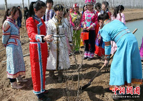 图为各民族青年相互合作,共植“民族团结树”。中新社发 任海霞 摄