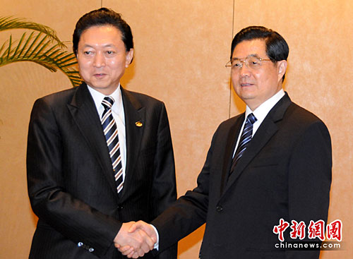 当地时间13日下午,正在华盛顿参加核安全峰会的中国国家主席胡锦涛在下榻酒店会见日本首相鸠山由纪夫。