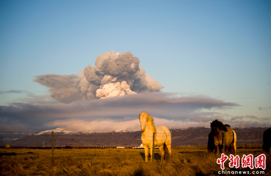 4月16日大量烟尘从冰岛埃亚菲亚德拉冰盖冰川下的一座火山升起。