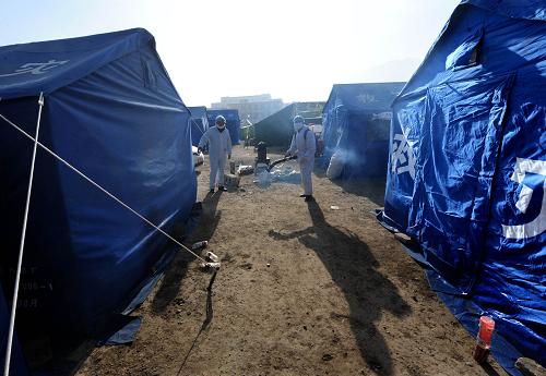 4月17日,两名疾控人员在玉树州体育场受灾群众安置点开展防疫消毒。李紫恒 摄