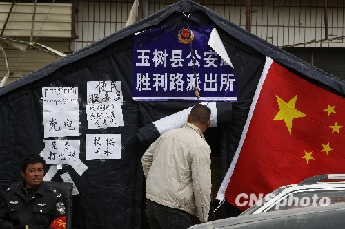 2010年4月19日,青海玉树县结古镇,玉树县公安局胜利路派出所的帐篷上张贴了多个服务宣传单,为受灾民众提供更多的服务。中新社发 盛佳鹏 摄