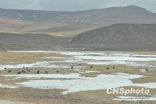 4月19日,新闻记者首次进入青海玉树7.1级强烈地震的震中点上拉秀乡日麻村,出乎意料的是全村无一伤亡,附近河曲冰雪消融,草原处处现牛羊。中新社发 贾国荣 摄