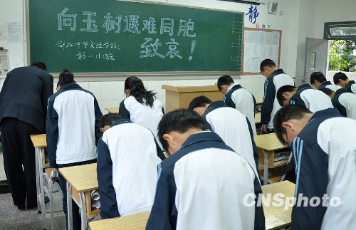 4月21日,四川省广安市近80万师生在上课前分别在自己的学校向玉树地震中遇难同胞致哀,并举行了庄严的降半旗仪式,表达心中无限哀思。中新社发 杜修战 摄