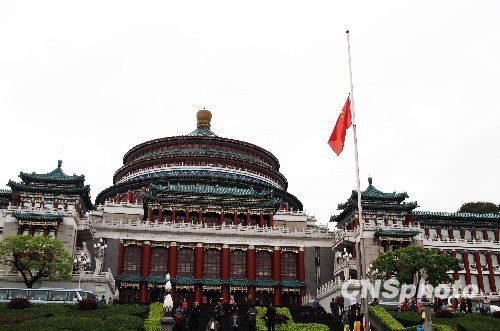 2010年4月21日,重庆人民广场为青海玉树地震遇难同胞降半旗致哀。中新社发 潘钰琳 摄