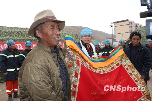 卓玛的家人向医疗队赠送锦旗。 中新社发 武警总医院供稿