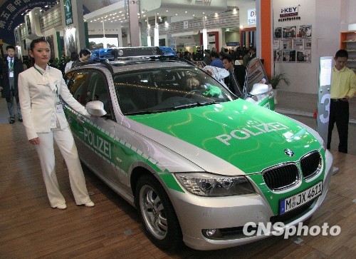 4月21日,在北京展览馆展出的新式宝马防弹车。中新社发 王振 摄