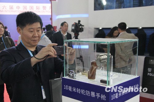 4月21日,在北京展览馆,一位观众正在拍摄新式警用装备。中新社发 王振 摄