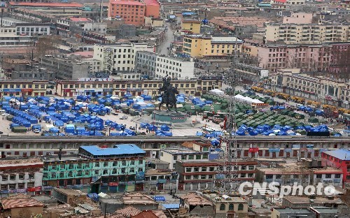 4月21日,地震发生后的第七天,记者登上4000米的山上拍摄了一组地震后的玉树县城。"4.14"地震发生后,玉树县城85%的房屋倒塌损毁。中新社发 刘忠俊 摄