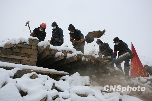4月22日,成都市民兵综合应急救援大队在雪中的玉树实施救援。22日凌晨开始的降雪给救援增加了极大的困难。中新社发 苏丹 摄