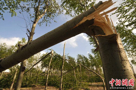 2010年4月26日,在京港澳高速邢台市内丘县金店村附近,百余颗杨树被大风拦腰折断。黄涛 摄