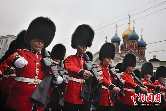 当地时间5月6日,英军士兵身着红色礼服参加在莫斯科红场举办的世界反法西斯战争胜利65周年阅兵式彩排式。