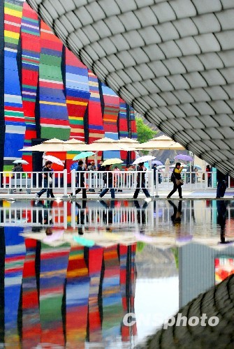 5月9日,游客兴致盎然游览上海世博园区。当天上海普降小雨,朦朦细雨为世博园区增添另一番韵味。