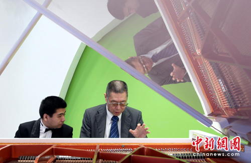 5月10日,著名钢琴家刘诗昆和盲人钢琴演奏家孙岩在上海世博会残疾人馆――生命阳光馆表演四手联奏。当日,世博会历史上首次设立的残疾人馆――“生命阳光馆”正式开门迎客。中新社发 汤彦俊 摄