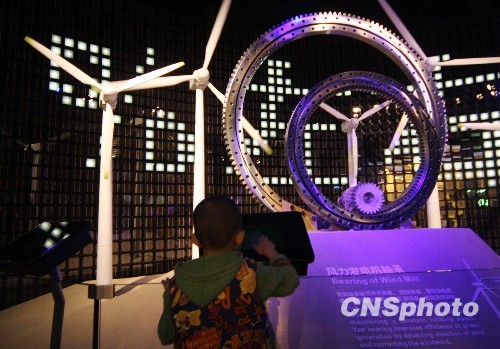 图为观众在体验风能发电过程。 中新社发 吴芒子 摄