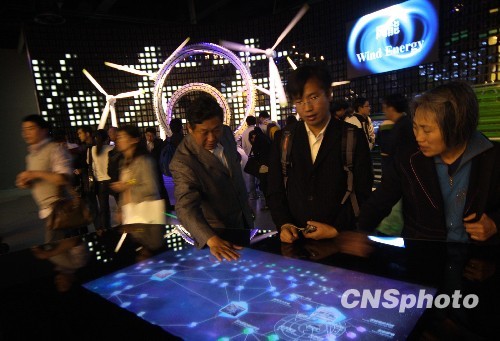观众通过电子触屏了解风电知识。 中新社发 吴芒子 摄