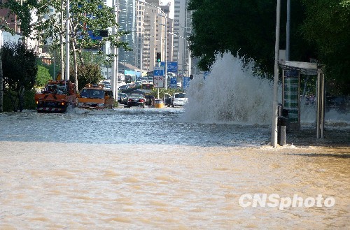 2010年5月25日下午,北京央视新址西侧,京广桥附近的水管突然爆裂,导致路面变成一片“汪洋”,部分交通路线临时变更。中新社发 玉龙 摄