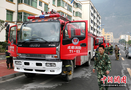 图为从成都调集的10多台消防车70名消防官兵赶到汶川增援。 中新社记者 刘忠俊摄