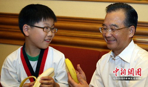 6月11日下午,中国国务院总理温家宝邀请参加“中韩青少年友好交流团”的中韩青少年到北京中南海作客。图为温总理请来自韩国上绿保育院的高民瑞小朋友吃香蕉。中新社发 任晨鸣 摄