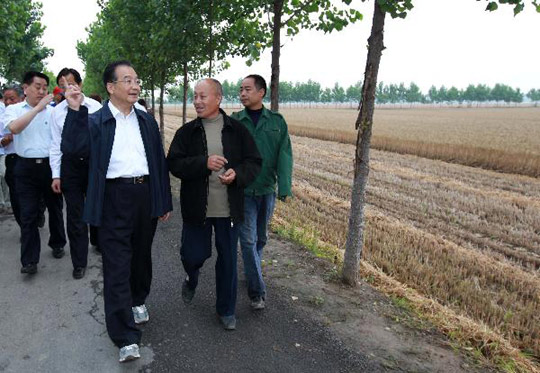 6月9日,温家宝在长葛市石象乡坡李王村的田间小路上与坡李王村支部书记李福成边走边聊。庞兴雷摄