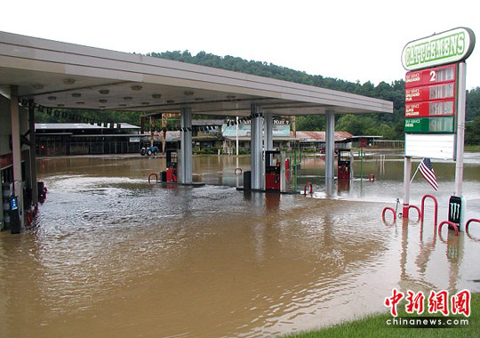 洪水灌入露营地附近的加油站。