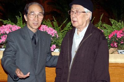 2004年2月4日,中国美术家协会在北京人民大会堂举办2004年新春联谊会,中国美协主席靳尚谊和老艺术家华君武在联谊会上亲切交谈。中新社发 张勤 摄