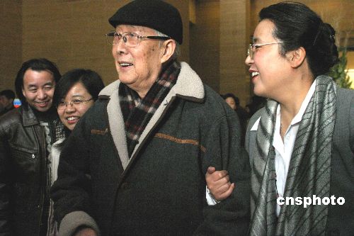 2004年12月10日,“第十届全国美展获奖作品展”在中国美术馆开幕。图为中国著名漫画家华君武(右二)参观了画展。中新社发 张勤 摄