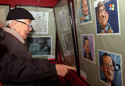 2004年1月11日,中国著名漫画家华君武正在饶有兴致地观看一组人物肖像漫画。全国科学漫画、连环画、插图大展当天在北京中国科技馆开幕,该展览共展出四百多件作品,回顾了中国科学美术近二十多年的创作历程。中新社发 张炜 摄