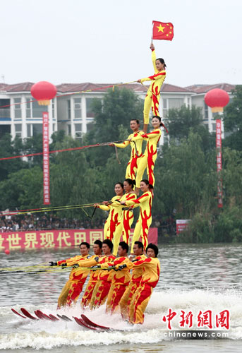 图为中国青年艺术滑水队表演的“水上金字塔”。中新社发 张浪 摄