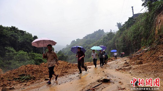 6月14日,南平西芹镇村民提心吊胆跑步快速穿过山体滑坡地带。这二日延平区降特大暴雨,强降雨导致延平、顺昌等地多处出现山体滑坡、泥石流等地质灾害。南平西芹受灾情况正在统计中。中新社发 柳涛 摄
