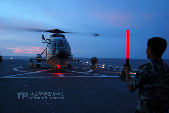 6月13日晚,来自南海舰队某登陆舰支队的舰艇与某型舰载直升机进行夜间着舰训练。他们克服舰艇行进间摇摆度大、夜间能见度低等困难,完成了多架次的起降训练,锤炼部队全天候执行任务的能力,提高了舰机协同水平。