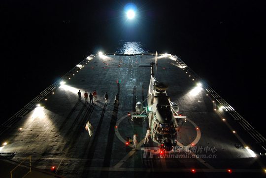 图为两架舰载机正在开展夜间着舰训练的场景。 李彦林 摄