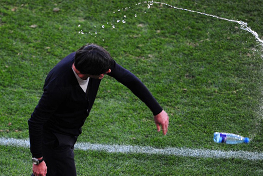 当地时间2010年6月18日,伊丽莎白港,德国队主教练勒夫因不满裁判的判罚愤怒地扔出矿泉水瓶。