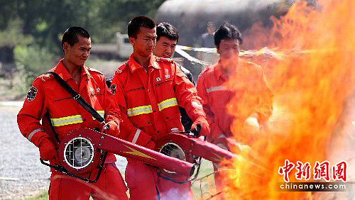 6月22日,新疆乌鲁木齐市燕儿窝风景区内,森林消防员正使用风力灭火机及水枪进行森林防火模拟演习。中新社发 刘新 摄